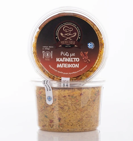 Συστατικά: Ρύζι Ελληνικό 99%, σκόνη καπνιστού μπέικον 1% (εκχυλίσματα μπαχαρικών(σόγια), αφυδατωμένα λαχανικά, ζάχαρη, αλάτι)