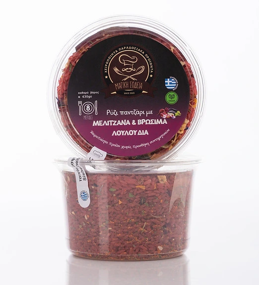 Συστατικά: Ρύζι Ελληνικό 94%,παντζάρι κυβάκια 1%, μίγμα (πράσινο μήλο, σχοινόπρασσο, αρωματικές ύλες βοτάνων, βρώσιμα λουλούδια 0,2%, ροδοπέτουλα καλέντουλα, τσίλι, εκχύλισμα μήλου, κρεμμύδι), μίγμα(μελιτζάνα 0,2%, σκόρδο, μαϊντανό, λιαστή ντομάτα, βασιλικό, αλάτι, κρεμμύδι)